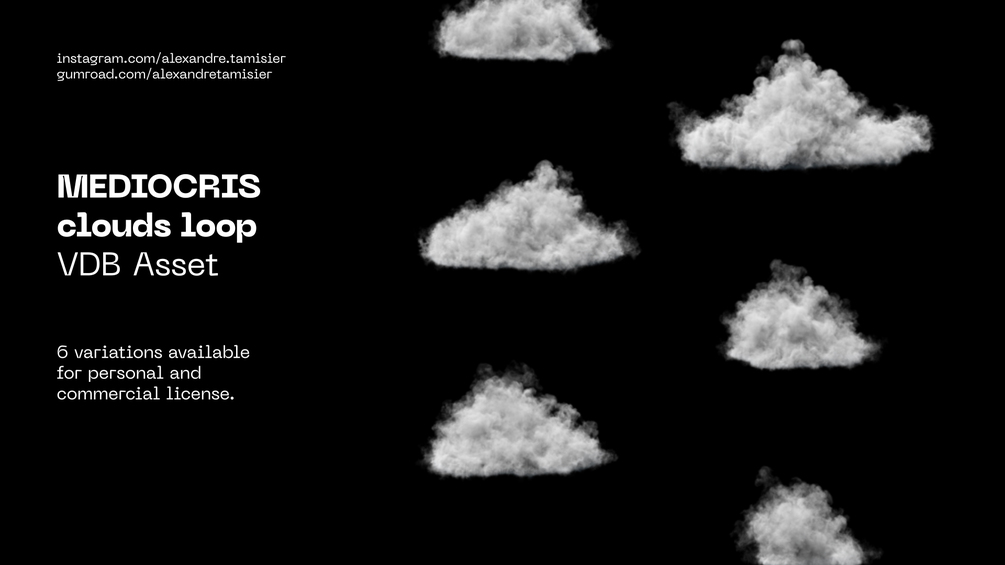 Animated loop simulation of a cloud named Mediocris. 6 variations available for personal and commercial license. I optimized the size of the files by keeping only the density in order to have an easier reading in the viewports / renderings !